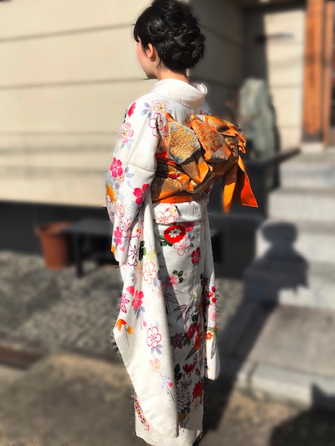 お友達の御結婚式の参列で、振袖をお召しになりました。スッキリと晴れ渡った冬の日、清々しく澄んだ空気の中、真っ白な振袖をお召しになった、色白なお嬢様は、まるで日本版の白雪姫のようでした。 字柄の入った白地に豪華な花模様の振 …