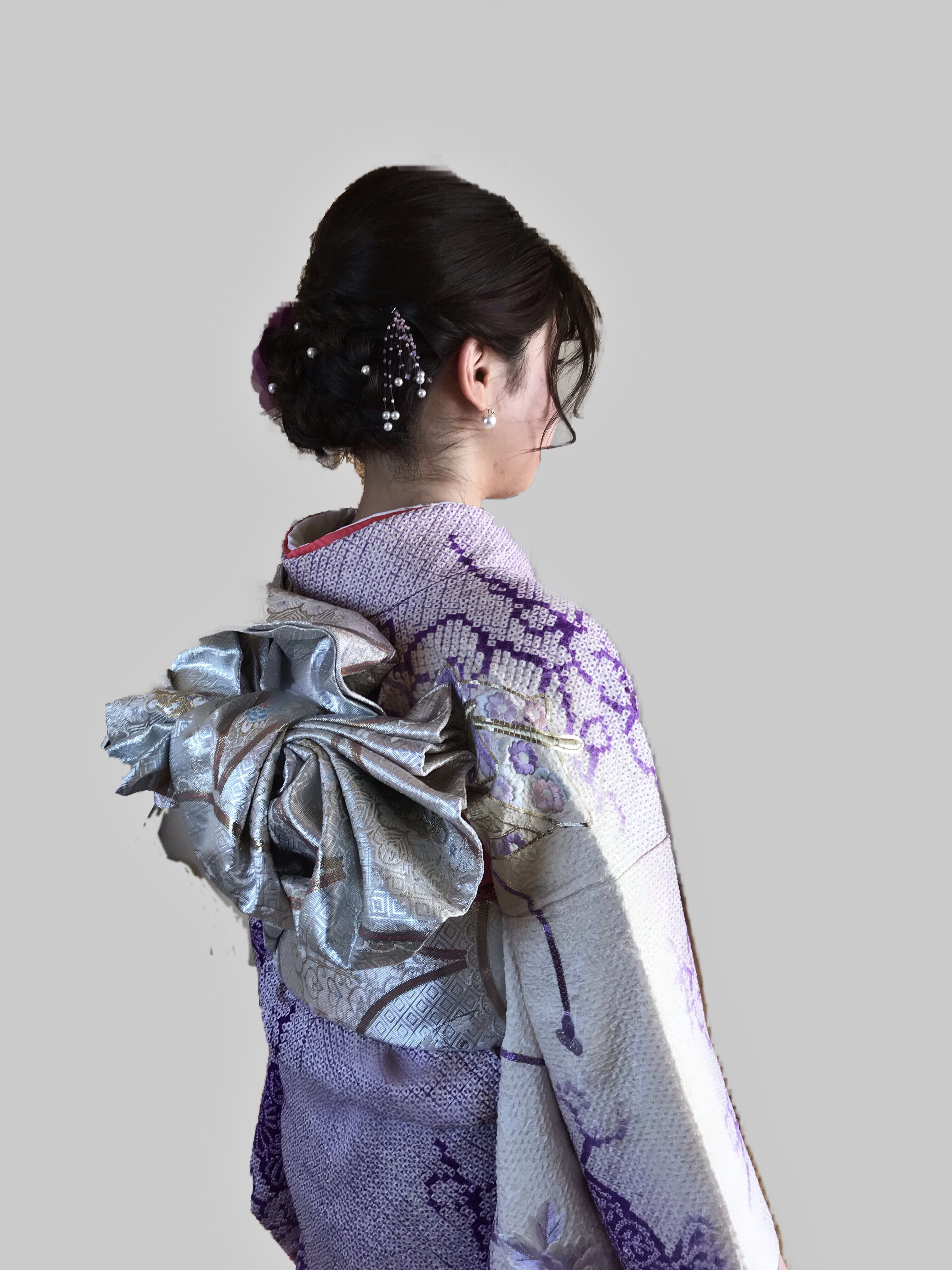 同級生の結婚式の参列にお友達同士で参列されました。薄紫色の総絞りのお振袖を、さらりと着こなされて大人の女性の美しさを感じました。 ご一緒に参列されたお友達は、お振袖は色鮮やかな水色の古典紋様、素晴らしい刺繍の帯を結ばせて …
