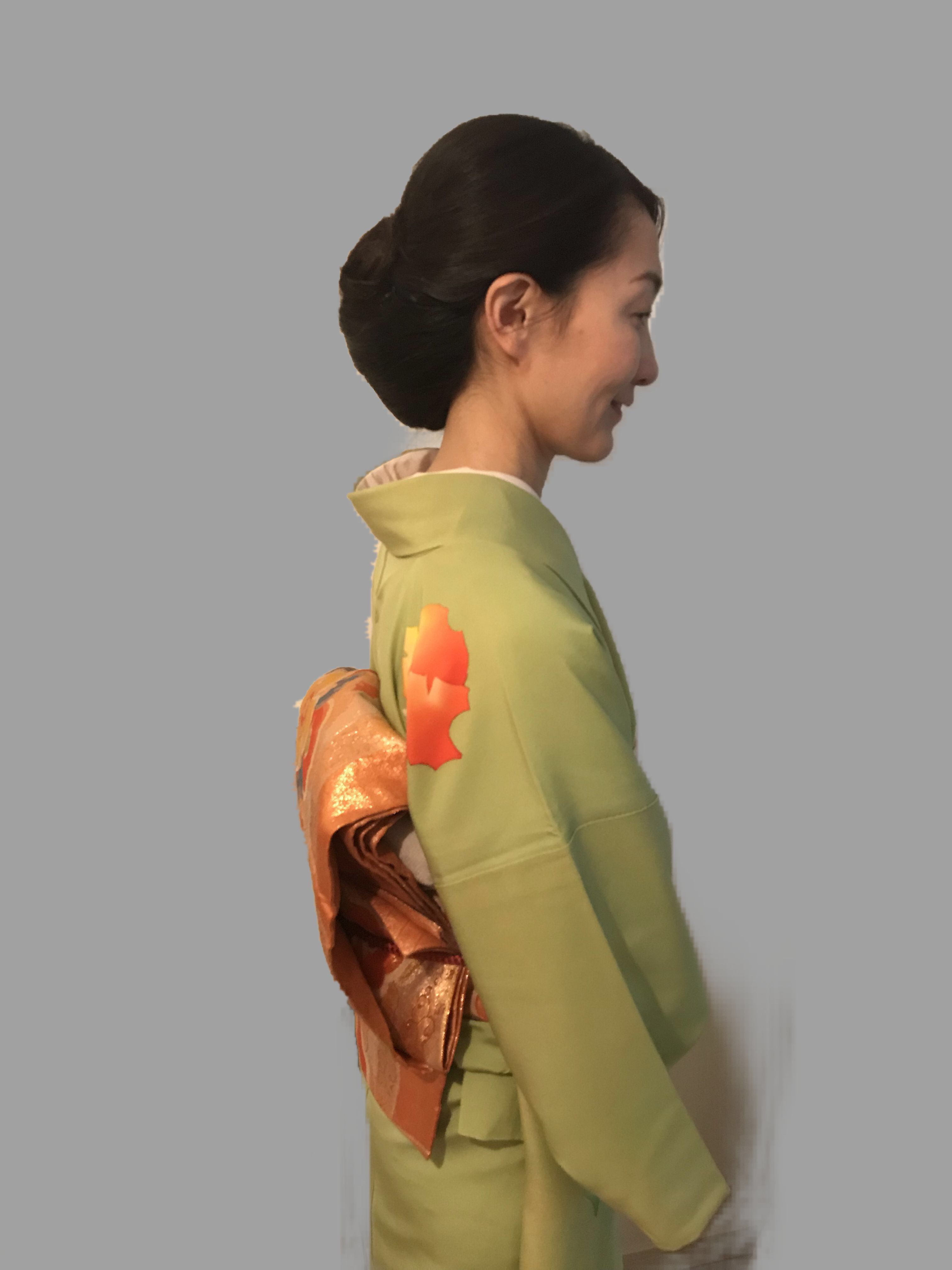 日本の伝統の楽器を演奏される為の装いです。スレンダーなお身体!!スモークグリーンにオレンジの洋花を染め抜いた訪問着に、同じオレンジの佐賀錦の帯で、ステージに立たれました。漆黒の御髪とともに。スポットライトの中、ひときわ美 …